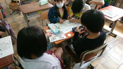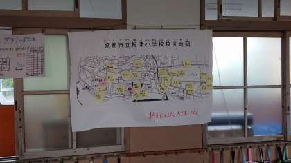 生活科の「まちをたんけん大はっけん」の学習で自分たちの住んでいる梅津の町にどんな場所があるか,どんな人がいるかみんなで付箋を校区地図に貼り,交流しました。フレンドマートや構口公園,梅宮大社などの身近な場所や見守り隊の人,空手の先生などいろいろな自分とかかわりのある人たちの名前が挙がってきました。来週実際に梅津の町探検に行きます。町を探検する中で,どんな知らない場所や人に出会えるか楽しみです。