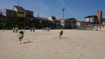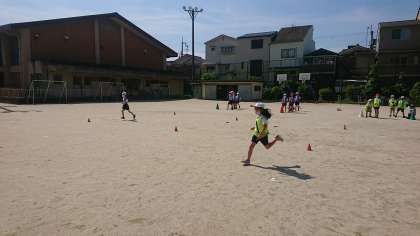 体育の「リレーあそび」で2つのコーンの間をチームごとに走ったり,スキップしたりして競走をしました。その時にコーンをどんな風に回ったら速く回れるか考えました。すると「小さく回るといいと思う。」と速く走るコツを1つ見つけていました。次にコーンの間にさらに2つコーンを並べ,くねくね走ったり,コーンをくるっと回ったりしていろいろなリレーを楽しみました。次は自分たちでコーンを置く位置など工夫して速く走るコツを見つけていきます。