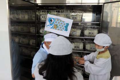 給食室では,調理員さんたちがいつも温かく迎えてくれます。時々,季節や料理にぴったりなお楽しみがあることがあります。今日は……背中にこいのぼりが!給食でも季節のメニューを楽しめるといいですね♪