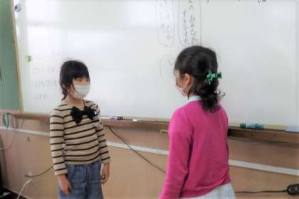 友だちと交流する練習が国語科で始まっています。少し緊張しながらも,教科書の例を見ながら,頑張って友だちに話しかけてみました。