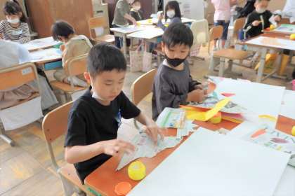次の図画工作科では,貼った画用紙にたくさん付けたしをしていく予定です。子どもたちが切れ端から想像したのは,水族館?それともジャングル?完成が楽しみです。