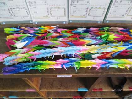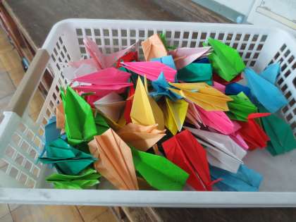 捧げる千羽鶴をつくっています。思いが届きますように!