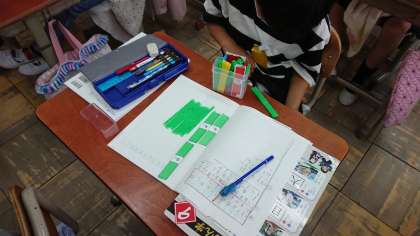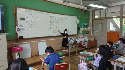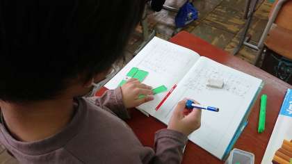 算数の「たし算とひき算」の学習で,2桁+1桁や2桁−1桁の計算の学習をしています。数え棒を使って10の束を作ってたし算をしたり,10の束をくずしてひき算をしたりしています。数え棒で慣れてきたらサクランボで計算する仕方にも挑戦しています。10の束を意識して学習を進めています。