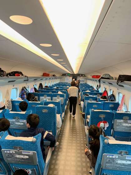 新幹線に乗っています。初めて乗る人たちは新幹線の速さに驚きながらも、とても楽しんでワクワクいます。