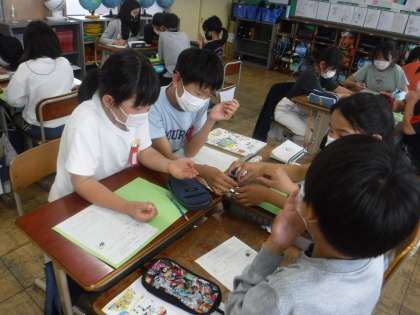 家庭科の学習で,お茶をいれるためにお茶の葉を観察しました。普段あまりじっくりと見ることがないため,興味津々な様子でした。「なんか茎のような部分がある」「こんなにちっちゃいんだ」とグループの友達と話をしながら観察していました。実際にお茶を入れるのが楽しみです。