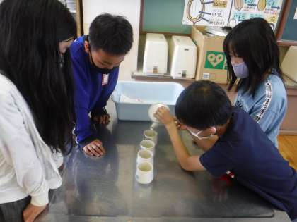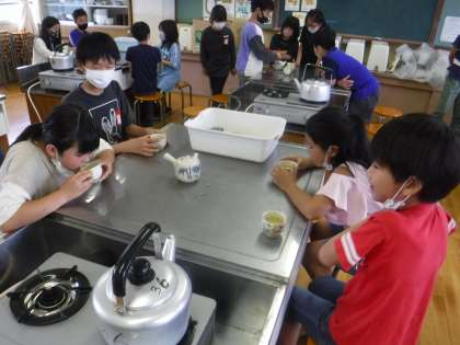 家庭科でお茶を入れました。やかんでお湯を沸かし急須を使いました。初めて使う子も多く,緊張しながらでしたが,グループで声をかけあい,おいしいお茶を入れることができました。みんなでおいしくいただきました。