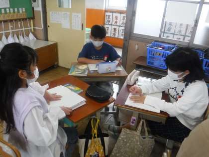 国語では友達のことを詳しく知るためにインタビューをしています。どのように聞けばよいのか,どう答えればよいのかを考えながら3人組でメモを取り合い進めています。友達の意外な一面を知ることができ,「そんなことが好きなんて知らなかった」と驚きながらわかったことを文章にまとめていました。