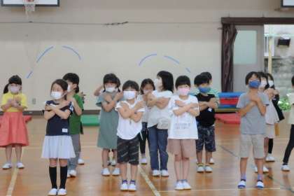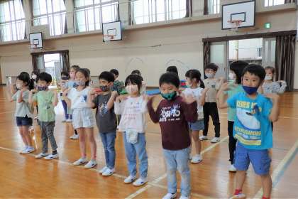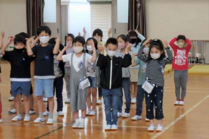 昨日の練習を踏まえ,今日は少し並び方を変えて練習にのぞみました。大体の流れは昨日でつかめたので,今日は声の大きさやタイミングをそろえる練習です!
