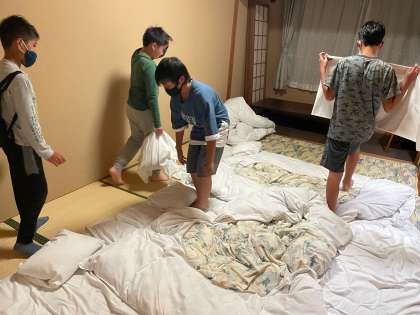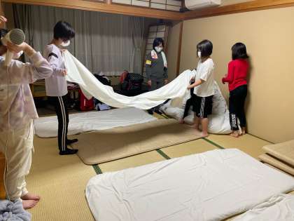 自分達で協力して布団を敷きます。