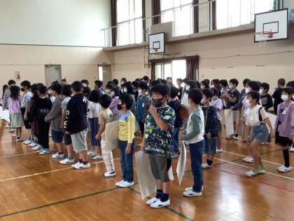 3年生は1年生に発表するテーマは「給食」です。みんなの大好きなぷりぷり中華炒めやにくじゃがを紹介します。大きな声で頑張ってセリフを言っていました。
