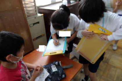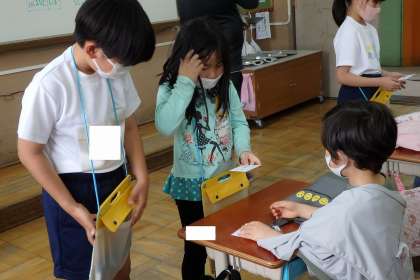 事前に作った名刺を1年生に渡して自己紹介!好きなものを描いた名刺は,「すごく上手な絵!」と,1年生たちにとっても喜ばれました。