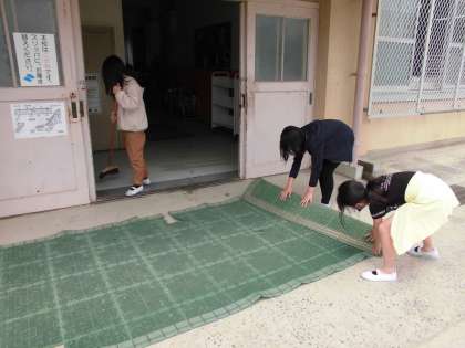協力してマットの下まで,掃いている姿を見つけました。自分の役割を果たすこと,協力すること,一生懸命取り組んでいる姿を見ると嬉しくなりますね。心まできれいになります。