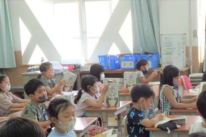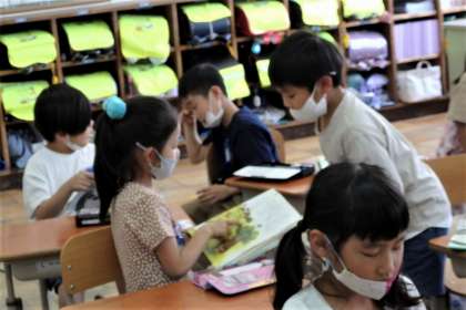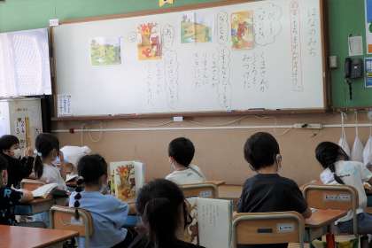 友だちと教科書の挿絵を指しあって話す姿も見られました。