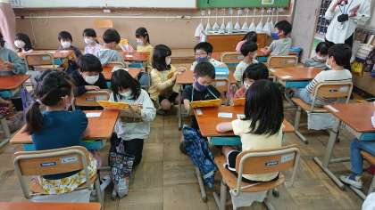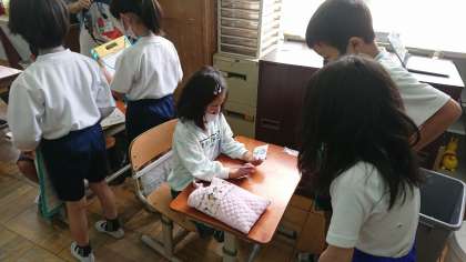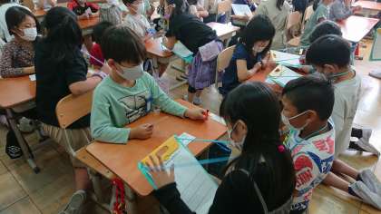 ぐんぐんタイムの時間にこれから遠足や学校探検で一緒のグループになる1年生の所へ,仲良くなるためにインタビューに行きました。好きな色や食べ物,キャラクターを聞き,自分の名前を覚えてもらうために名刺を渡しました。インタビューを終えて帰ってきて「1年生と少し仲良くなれた。」と多くの子がいっていました。これからの活動でさらに仲良くなれればと思います。