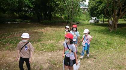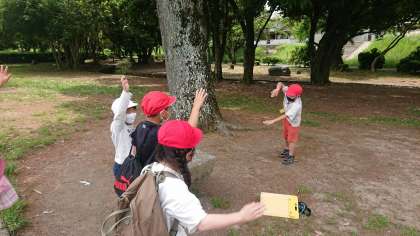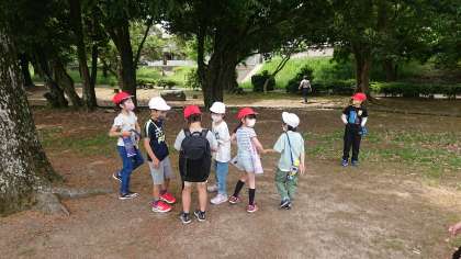 嵐山東公園に到着して,1年生と2年生でグループになり,『クイズラリ—』に取り組みました。写真をヒントにチェックポイントに向かい,そこでクイズやジェスチャーゲームなどにチャレンジしました。クイズと同時にキーワードを見つけ,最後の門番への合言葉も探していきました。やさしく声をかけて1年生を連れて歩く2年生。輝いていました。