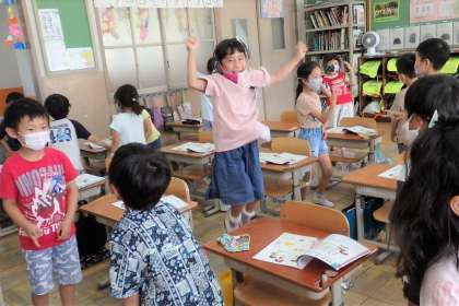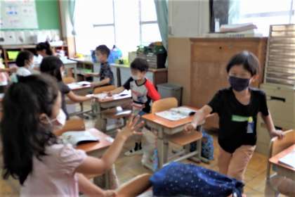 音楽科では,拍に合わせて手拍子したり体を動かしたりする学習をしています。『じゃんけんぽん』の曲では,「たん・たん・たん・うん」のリズムが出てきます。そのリズムに合わせて手を叩いて,じゃんけん大会です♪