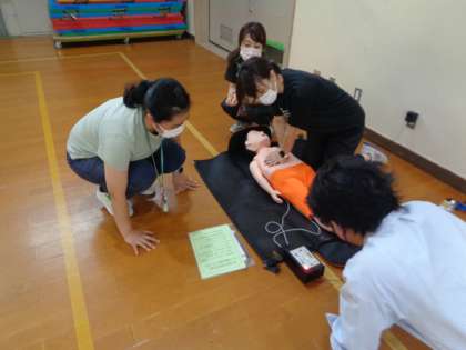 教職員に向けた救命救急講習を行いました。毎年取り組んでいますが,今年度は水泳指導をイメージして行いました。