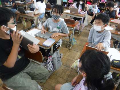 水から発見で取り組んだことを写真にとり,鑑賞しました。それぞれのグループで写真を見ながら名前を付けたり,アピールポイントを考えたりしました。その後,他のグループの写真を見ながら鑑賞しました。色の使い方や水との混ぜ方など細かな部分の良さにも気づいていました。