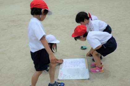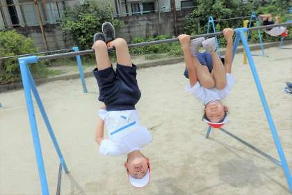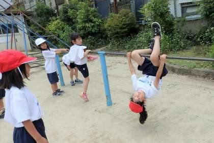 「地球回り」や「こうもり」は,逆さにぶら下がるのに勇気がいる……という子も多いです。友だちのお手本を見て,自分もチャレンジ!中には友だちにコツを教えてくれる子や,「大丈夫,できてるよ!」「連続技すごいなあ!」と,素敵な声掛けをしている子もいました。