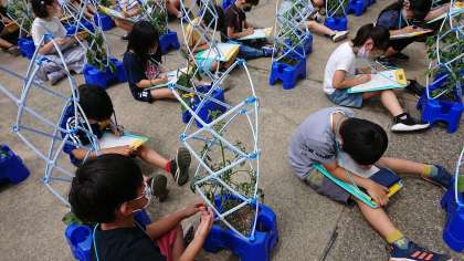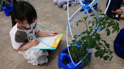 生活科の学習で育てている夏野菜の観察に行きました。前回から変わったところを中心に観察すると「葉っぱの数が増えた。」「つるが伸びてきた。」「黄色い花が咲いていた。」「小さい実ができていた。」とたくさん発見がありました。さらに観察と水やりを続けていきたいと思います