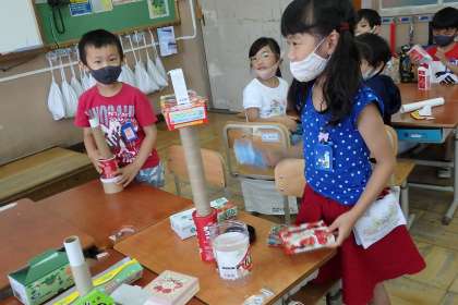 この日の学習では,箱などのを使って積んだり転がしたりして遊んでみました。積み木のように高〜く積んで高さチャンピオン!筒を足のように並べて動物園!みんなで形の特徴を生かして楽しみました。