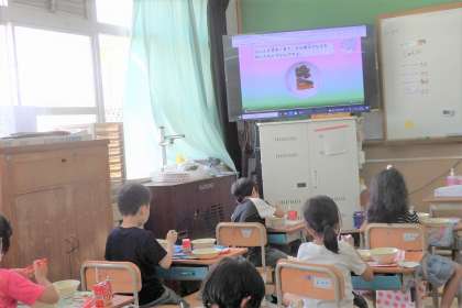 先日,栄養教諭がしてくださった『にしんなす』のお話。今日は朝から給食室前に「なすびくん」が飾られているなど,親しみを持てる取り組みもたくさん!給食時間中は,『にしんなす』について説明されたムービーを見ながら食べました。