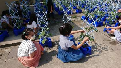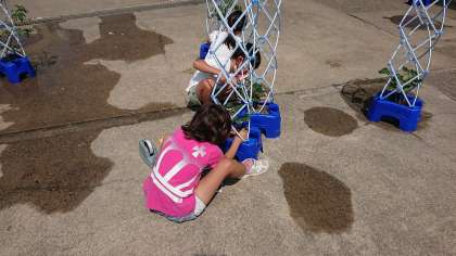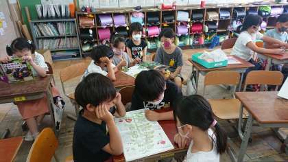 育てている夏野菜のお世話をどうしたらいいか本を使って調べました。「わき芽を切ること」や「セロハンテープを使って虫を捕ること」など実践していきました。これからもお手入れをがんばっていきたいです。