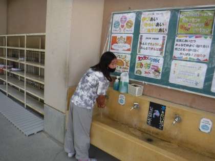 保健委員会では毎週きめられた時に,水道のアルボースや石けんの補充をしています。クラスの人たちと声をかけあって忘れないように行っています。みんなが気持ちよく過ごせるようにがんばっています。