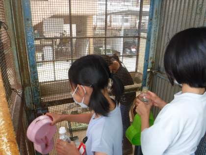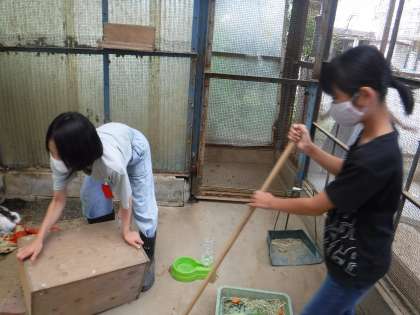 飼育委員会ではうさぎ小屋の掃除をしています。水替えやえさやりとともに小屋の中をきれいに掃除しています。きれいになった飼育小屋は気持ちいいのでしょうか。ハッピーもラッキーもおとなしく待っています。
