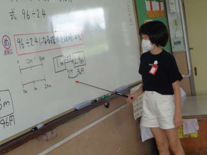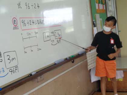 算数科の学習で「小数のわり算」に入りました。今日は,なぜこのような式になるかを説明していきました。図を用いながら説明する子が多く,考えを深めることができました。