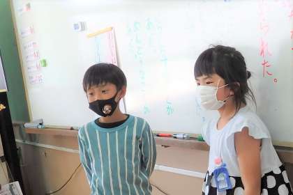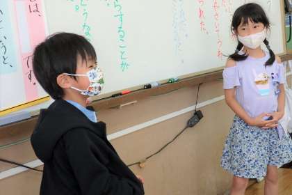 国語科『わけをはなそう』では,友だちとの交流を多く取り入れています。教科書には,笑顔の女の子と悲しそうな顔の女の子。絵を見ながら,「どうしてですか?」を,伝え合いました。