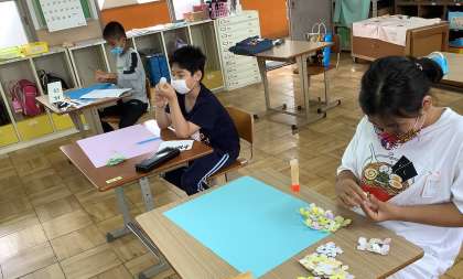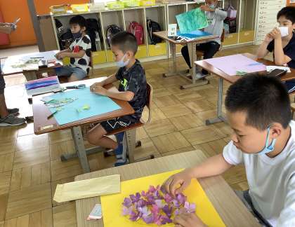 図画工作科の学習で,あじさいを作っています。画用紙に色を塗って,花の形に切り,少し折り目を付けて立体風に見えるように制作しています。素敵な色使いで,出来上がりが楽しみです。