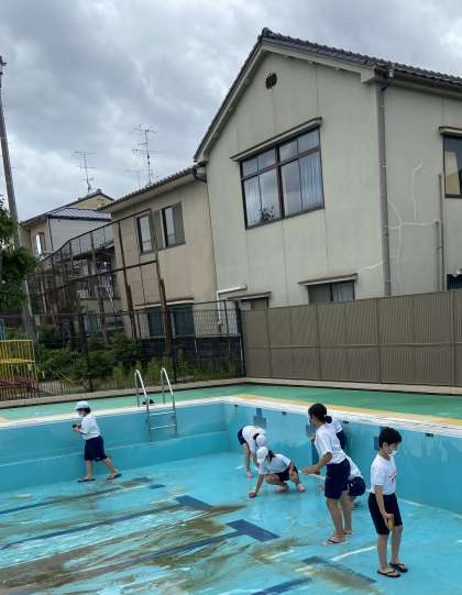雨の合間をぬって,プールの清掃をしました。プールの中やプールサイド,更衣室などを掃除しました。はじめは泥だらけのプールでしたが,あっという間にきれいになってきました。プール学習が待ち遠しいですね。