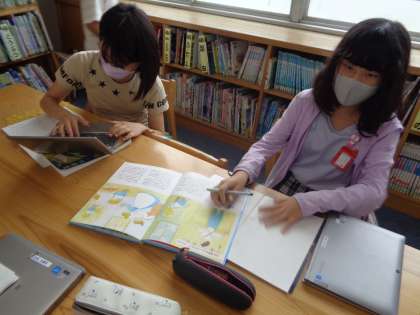 国語科の学習で,自分たちの過ごしている学校や地域に「みんなが過ごしやすくなるためにあるもの」について考え,調べています。今日は図書室で本を使って調べたり,タブレットを用いて調べたりしました。今後は,調べたことをまとめていく予定です。どんな風にまとめられるか楽しみです。