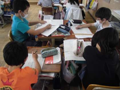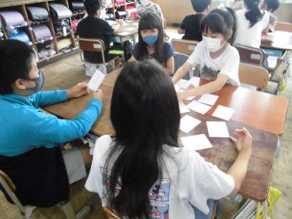 国語の学習では,つなぎ言葉のはたらきを知り,前後の文章に合ったつなぎ言葉を選ぶ学習をしていました。それぞれのつなぎ言葉の働きを学習したあとには,つなぎ言葉を使ったゲームをしました。子どもたちは文に合ったつなぎ言葉を選ぶことができていました。