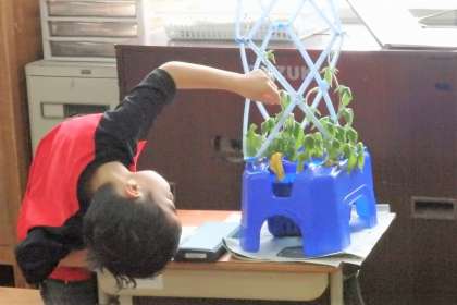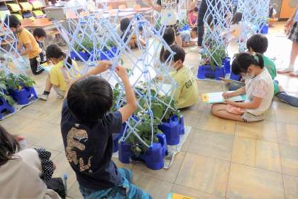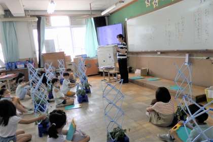朝顔のツルが長く伸びて,支柱に絡まるようになりました。今回の観察は,国語科の『おおきくなった』と関連付けて詳しく観察します!