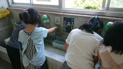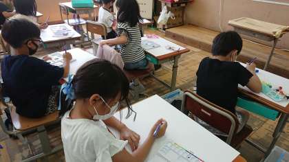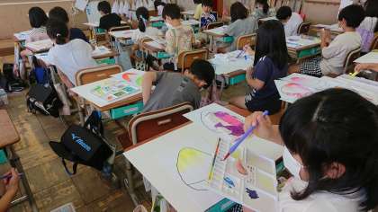 図画工作の学習で「初めての絵の具」に挑戦しました。筆洗やパレットの使い方を学習し,早速絵の具をパレットに出して画用紙に色を塗ってみました。水の量で色が変わったり,違う色同士を混ぜると違う色になったり,絵の具を使っていろいろ試してみました。最後にかき氷に上から水の量でグラデーションをつけ,好きな味のシロップをかけたように表現しました。「次も絵の具使いたい。」と絵の具の楽しさに,はまったようです。片付けもきっちりできました。