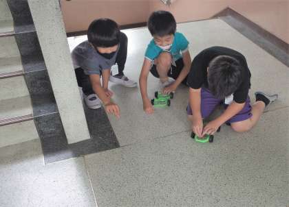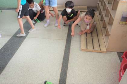 ゴムの力で動く車をつくり,動かして楽しみました。