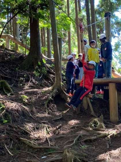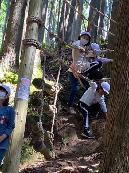 自然散策グループとのんびりグループに分かれて活動しました。散策中にアスレチックを発見しました!