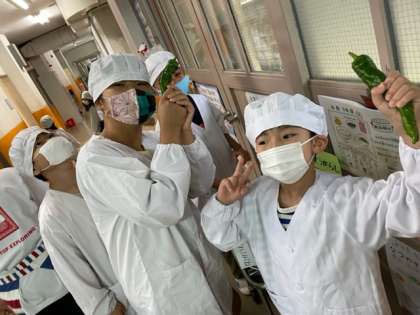 給食室の前に大きな万願寺とうがらしが置いてありました。万願寺とうがらしは今が旬です。夏野菜や京野菜に触れ,どんどん野菜のことを好きになってほしいです。