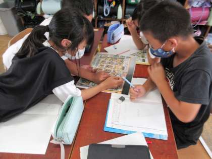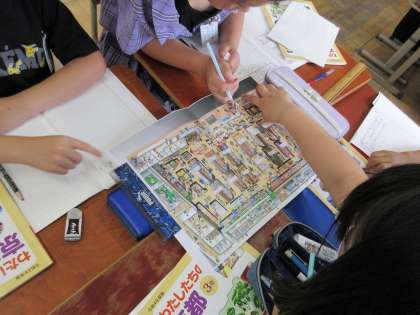 スーパーマーケットの店内図を見て,お店の工夫を話し合いました。