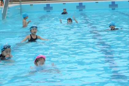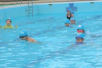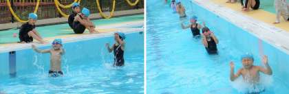 今回のプールは,暑すぎないとてもよい気候。プールでの学習も気持ちよく過ごせました。今回の水泳学習は少し深めで,顔を付けたり鼻でブクブクしたりする練習をしました。