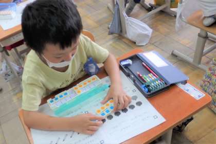 確かめる時は,数図ブロックを使い「セットにしてサヨナラ〜!」と動かして,差を比べる時のイメージをつかみます。「どちらが多い?」「違いはいくつ?」の問題の時は,この学習をしっかり思い出して問題を解けるといいなあと思います。
