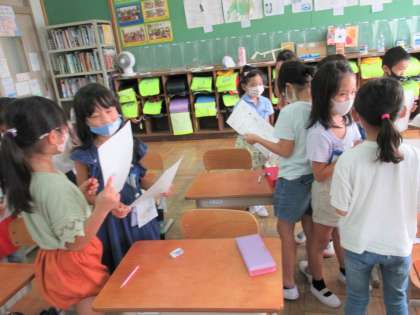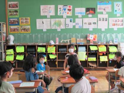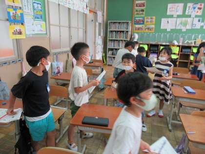 夏休み中どんなことがあったか、話している様子です。お出かけした子、おいしいものをたくさん食べた子……