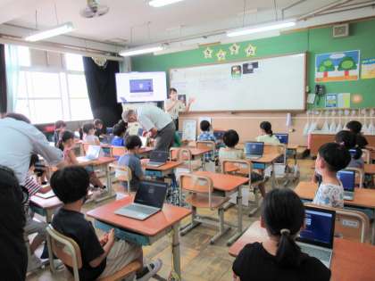 タブレットの学習がありました。1年生たちがタブレットに触れるのは初めてです。初めに扱い方やルール、マナーについてしっかり確認してから学習に入りました。