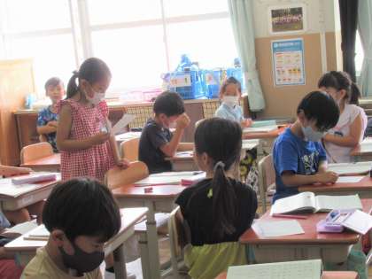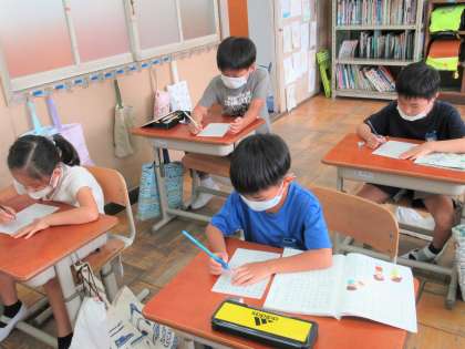 国語科『たのしいな ことばあそび』の学習では、マス目いっぱいに並ぶ平仮名の中から知っている言葉を探す活動をしました。たて・よこ・ななめ……いろいろな所に言葉がいっぱいかくれんぼしています。子どもたちは夢中になって探していました。