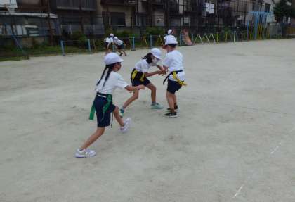 これから体育では、陣取りゲームの学習としてタグラグビーを行います。