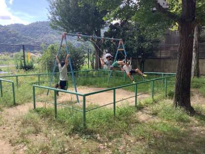 今日行ったどの公園よりも大きくたくさんの遊具があり,子どもたちは楽しそうでした。しかし,滑り台は破損していたために,使用することはできませんでした。