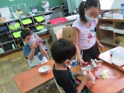 夏休み中、たくさんのお花を集めていただきありがとうございました。今日は、生活科の時間に凍らせた花をぎゅ〜っと絞って色水遊びをしました。