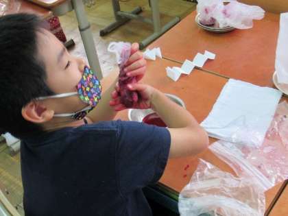 お花をネットに入れて絞るととっても鮮やかな紫色の汁が出てきます。手を真っ赤に染めながら、子どもたちは「めっちゃ出てきた!」と大はしゃぎ。出てきた色水に和紙を浸して、きれいな模様を作っていきました。どんな模様になったかな?